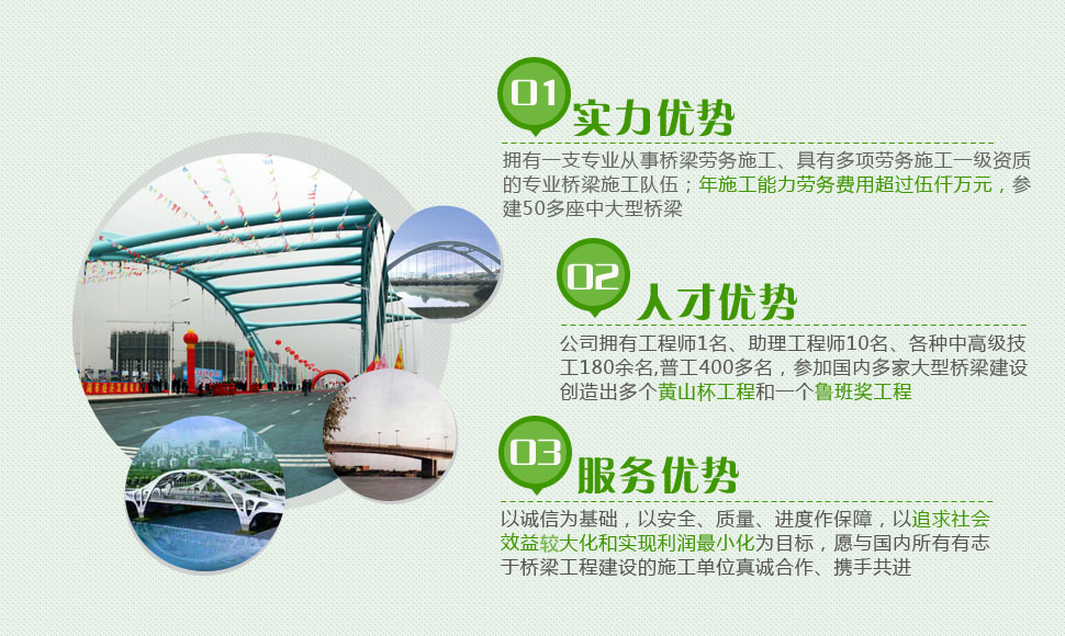 瑞通建筑勞務公司于2008年成立,是一支專業從事橋梁勞務施工、具有多項勞務施工一級資質的專業橋梁施工隊伍;年施工能力(勞務費、設備費)超過伍仟萬元;公司的主要技術員工大部分來自安徽省路橋公司,公司總經理和大部分員工最早于1988年從事專業橋梁施工至今。 瑞通勞務公司雖然成立較晚,但是由于早期一直跟隨安徽路橋和省內外橋梁施工單位多年,參建50多座中、大型橋梁;瑞通公司現具有較高的管理能力、施工能力和擁有豐富的各種橋型施工實踐經驗、技術;公司擁有橋梁相配套的各種小型機械設備、多種型號門式起重機20臺(5t/20m,5t/34m,5t/36m,65t+5t/20m,50t+50t/34m,60t/30m,100t/3...